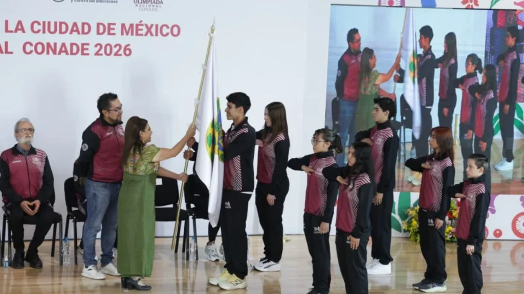 Ciudad De México, 13 de abril de 2026.- La Jefa de Gobierno de la Ciudad de México, Clara Brugada, abanderó a la delegación capitalina que participará en la Olimpiada Nacional de la Comisión Nacional del Deporte (Conade) 2026. Durante el acto solemne, la mandataria anunció la implementación de apoyos económicos para los atletas que obtengan medallas en las 46 disciplinas deportivas del evento.