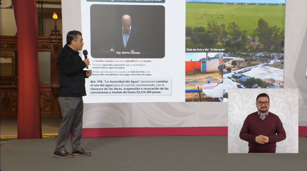 Entre los casos específicos de irregularidades señalados por las autoridades figura la situación en Querétaro, donde la familia Calzada concentra 628,000 metros cúbicos de agua distribuidos en cinco títulos. Según el director de Conagua, los pozos registrados bajo uso agrícola por este grupo son destinados en realidad para comercializar agua en pipas, abastecer desarrollos inmobiliarios y servir a un club de polo. En el mismo contexto se mencionó el caso de Zacatecas, donde siete títulos originales fueron transformados en 50, generando ganancias de hasta 54 millones de pesos.