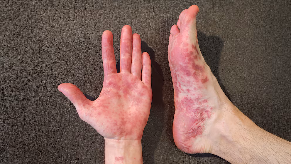 • Erupción con vesículas en palmas y plantas; a veces se extiende a brazos, piernas o glúteos.