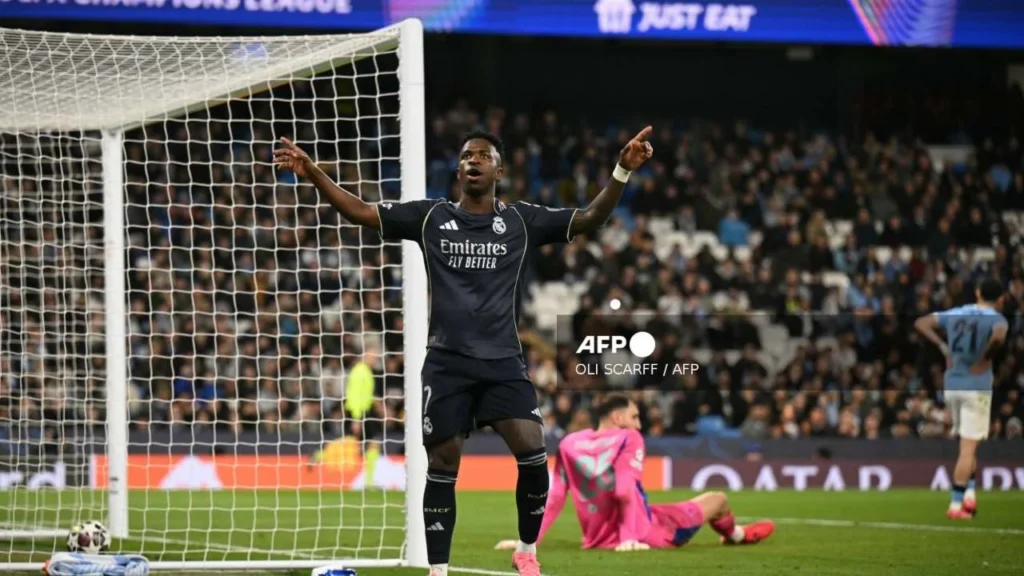 Manchester, Inglaterra., 18 de marzo de 2026.- El Real Madrid certificó su pase a los cuartos de final de la UEFA Champions League al vencer 2-1 al Manchester City en el Etihad Stadium, con un marcador global de 5-1 que reflejó su superioridad en la eliminatoria. El brasileño Vinícius Júnior fue la gran figura del partido al anotar un doblete, incluido un penal en el primer tiempo, mientras que Erling Haaland descontó para los locales, quienes jugaron con diez hombres desde el minuto 22 tras la expulsión de Bernardo Silva.