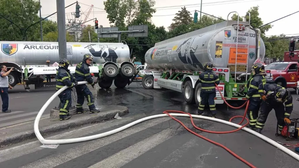 Por otro lado, el 10 de abril, una pipa cargada con diésel quedó ladeada en la intersección de la Avenida de las Torres y Sur 122, en la colonia José María Pino Suárez, alcaldía Álvaro Obregón. La unidad, de doble remolque con capacidad de 68 mil litros, sufrió el incidente cuando su conductor intentaba realizar una vuelta en ‘U’, quedando el primer contenedor en esa posición.